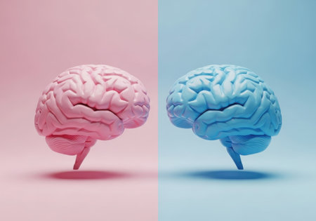 Two stylized brain models, one pink and one blue, are positioned against a split background of pink and blue.