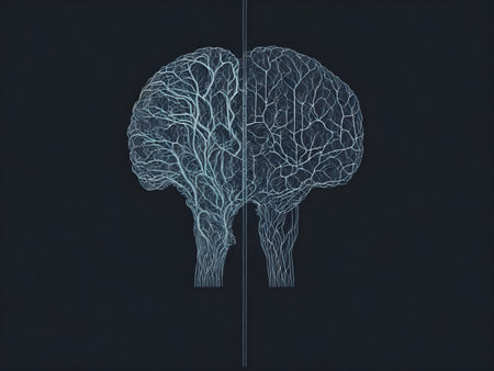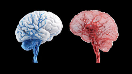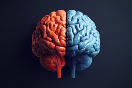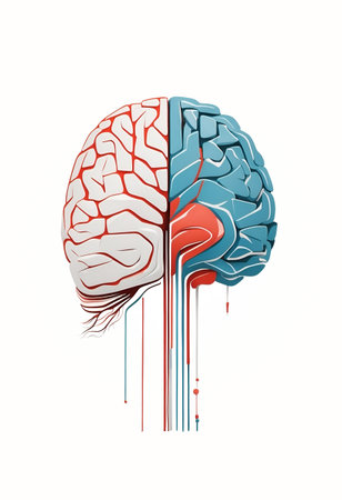 This illustration depicts a brain with interconnected neural networks, featuring blue and red hemispheres
