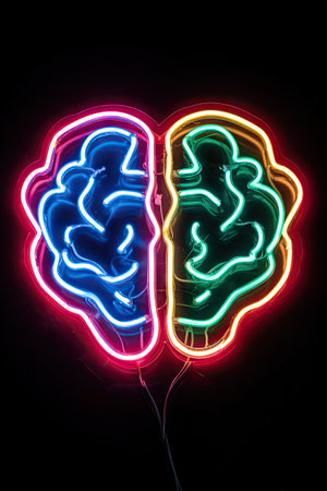 A neon brain illustration is displayed against a black background. The image features a symmetrical composition with vibrant colors highlighting the brain's hemispheres. The lighting creates a dynamic visual with a modern, artistic style. This artwork could be used in design, advertising, and editorial contexts.