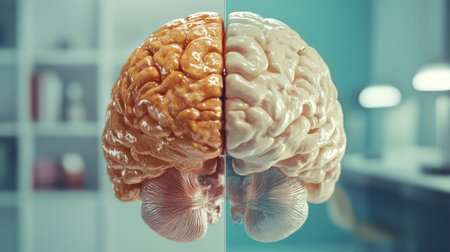 This image depicts a split view of a human brain, illustrating the differences between healthy and damaged areas. It serves as a visual tool for education and awareness in neuroscience.