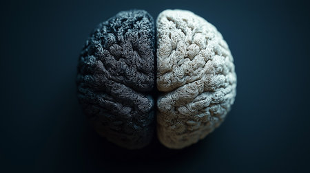 This artwork depicts a creative representation of a brain split into two contrasting colors, showcasing the different aspects of thinking and emotions, ideal for psychology and creativity themes.
