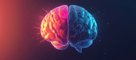 Futuristic illustration of a human brain split into two halves with vibrant colors, showcasing the duality of creativity and logic in a digital concept.