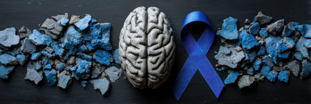 A clay brain model is placed at the center, surrounded by a blue PTSD awareness ribbon and textured fragments, highlighting the impact of mental health.