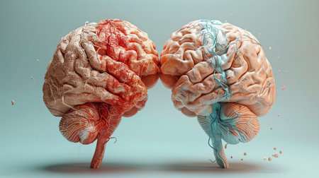 This evocative image portrays an artistic brain, divided by light and dark, symbolizing memory challenges and neurological vulnerability The interplay of light and shadow highlights the fragility of cognitive function, emphasizing the crucial importance of brain health awareness This conceptual piece invites contemplation on the complex balance of cognition AI Generative