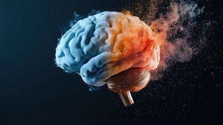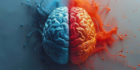 Abstract representation of a human brain split into blue and red halves with colorful splashes in background.