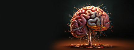 Highly detailed 3D render of a human brain showcasing its intricate structure and blood vessels against a dark background.