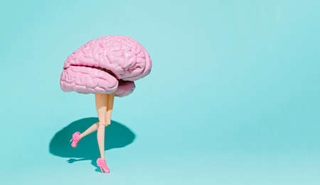 Pink human brain with doll legs walking and moving on pastel blue background. Creative thinking concept. Minimal knowledge, brainstorming or business idea layout with copy space. Abstract pop art.