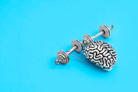 Creative composition made of a steel copy of a human brain lifting dumbbells. The concept of brain exercises to strengthen the mind.