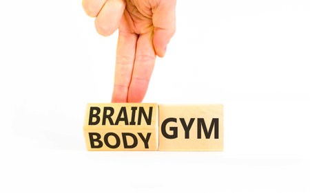 Body vs brain gym symbol. Concept words Body gym to Brain gym on beautiful wooden cubes. Beautiful white table white background. Business healthy lifestyle and body vs brain gym concept. Copy space.