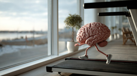 This vibrant cartoon illustration showcases a brain symbolizing fitness and productivity, surrounded by elements of health, motivation, and growth. Ideal for wellness themes.