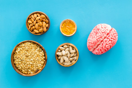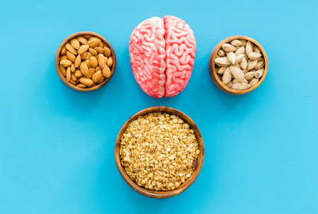 Human brain model with nuts and grain, top view. Healthy food for the brain.