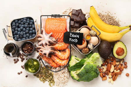 Best food for brain and memory on light background. Food for mind and charge of energy. Healthy lifestyle. Top view
