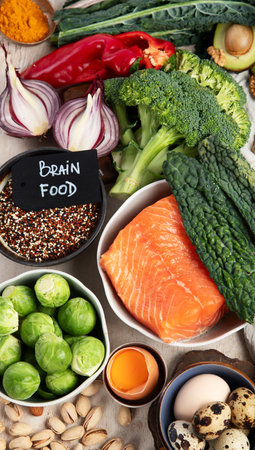 Human brain drawing with variety of healthy fresh fruits and vegetables on the table. Concept of balanced nutrition for brain health
