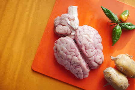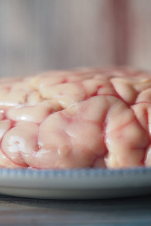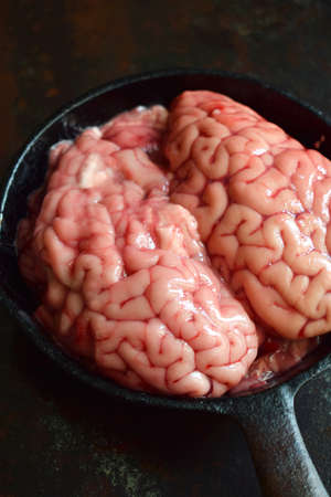 Pink brain before cooking on black metal frying pan. Raw meat. Offal.