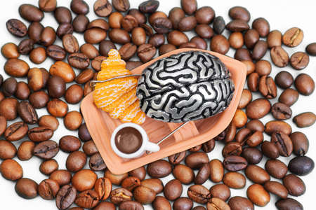 Steel copy of a human brain holding a coffee cup and a croissant while boating on a layer of roasted coffee beans. Creative coffee break composition.