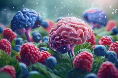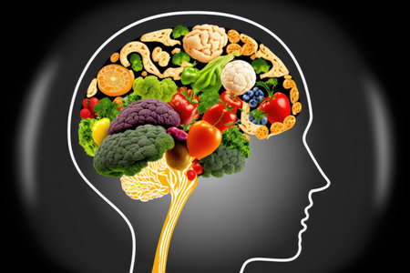 Colorful arrangement of fresh fruits and berries shaped like a human brain, highlighting the role of nutrition in cognitive function and overall well-being
