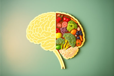Health in your brain. Fresh vegetables in human brain symbolizing health nutrition on colorful background. Generative AI