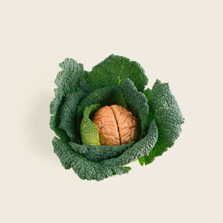Abstract surreal concept with human brain growing in the green savoy cabbage leaves on isolated pastel beige background. The idea of brain food, intellectual progress, creativity or brain development.