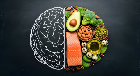 A striking flat lay comparing a chalk drawing of a brain to a hemisphere made of healthy brain foods like salmon, avocado, almonds, and broccoli. This image visualizes the link between nutrition and cognitive health.