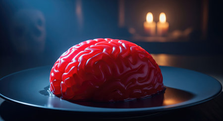 A close up of a brain-shaped dessert on a black plate, with candles in the background, creating a spooky atmosphere.