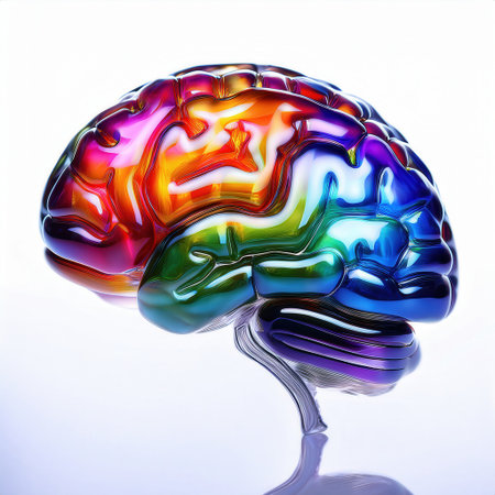 A unique brain structure displays a mesmerizing blend of transparent colors, reflecting light and creating a striking visual experience.