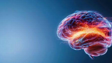This futuristic digital image features a glowing brain with intricate neural networks, symbolizing technology and science's impact on understanding human cognition and creativity.