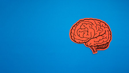 A brain shape made from red paper on a blue background. Awareness of Alzheimer's, Parkinson's, dementia, stroke, seizure, or mental health. Neurology and Psychology care. Top view. Space for text