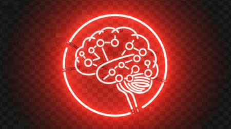 A red neon brain outline depicted as a network of interconnected nodes and lines, glowing against a dark, abstract background.