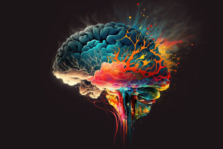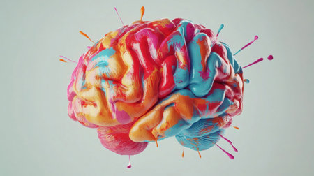 A colorful brain adorns a light background, showing vivid splashes of paint in an artistic expression of creativity and thought.