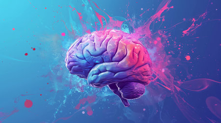A vibrant brain illustration emerges amidst a colorful, speckled backdrop, symbolizing intellect's fusion with technology, creating a captivating atmosphere of innovation.