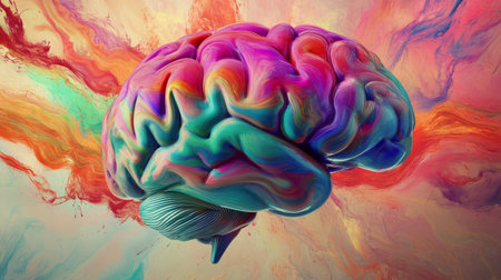 AI generated surreal artwork of a vibrant human brain with neon colors on fluid abstract background symbolizing imagination creativity and energy