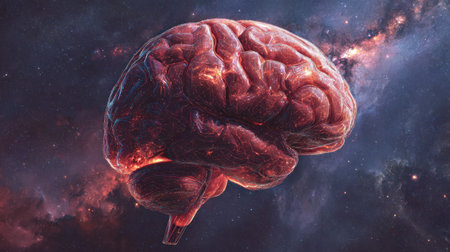 This image showcases a detailed rendering of a human brain against a backdrop of space. The brain exhibits a textured, reddish-brown appearance, possibly created through digital art techniques. The composition uses a shallow depth of field, with the brain as the central focus. The image can be used for science, education, or conceptual purposes.