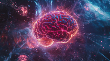 Vibrant digital brain with colorful neural connections and cosmic elements