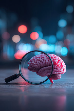 A close-up view presents a pink brain model positioned behind a magnifying glass. The image exhibits a high-contrast style with shallow depth of field, accentuating the subject. The background features blurred lights, creating a moody atmosphere. This visual is suitable for scientific, educational, or conceptual projects.