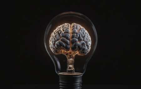 This striking abstract image showcases a glowing human brain, symbolizing creativity and thoughts. It emphasizes neural connections with vibrant energy against a dark background.