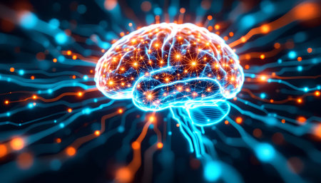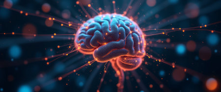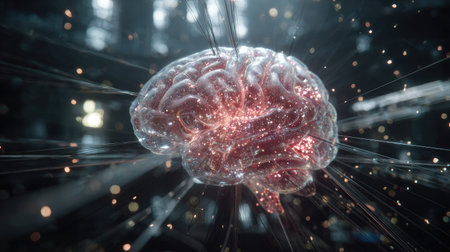 A captivating digital illustration showcasing a human brain with intricate glow effects, representing neural connections and the complexity of cognitive functions in a futuristic context.