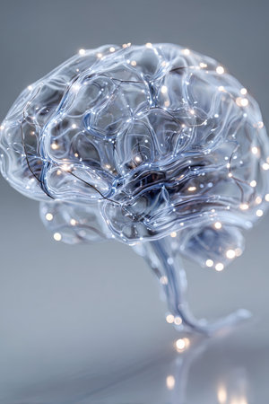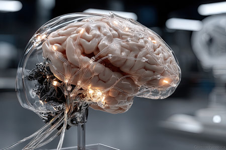 An artistic representation of a brain encased in glass, surrounded by glowing lights and wires, symbolizing the fusion of technology and neuroscience in a modern aesthetic.