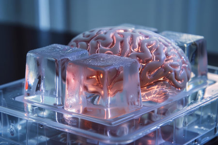 A brain preserved in a clear ice tray, like a set of frozen idea cubes ready to be dropped into a drink