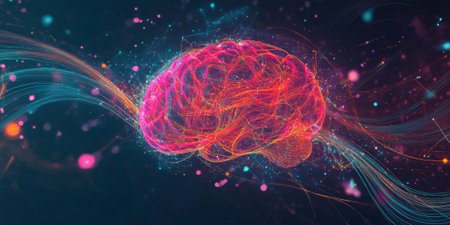 A vibrant background with a brain made of overlapping, swirling colors and abstract shapes, set against a smooth, gradient backdrop.
