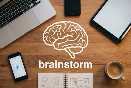 Brainstorming Concept. Brainstorm word written on photo of diverse group of people discussing plan in the background