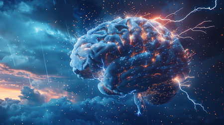 A glowing brain appears amidst vibrant clouds, illuminated by bright light effects, creating a surreal atmosphere.