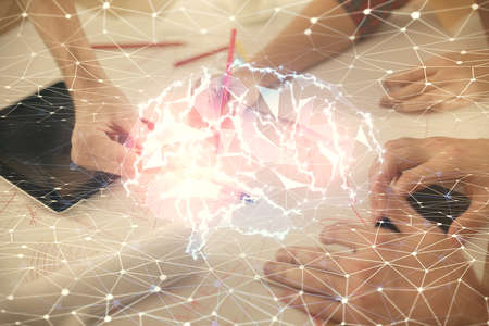 Double exposure of man and woman working together holding and using a mobile device and brain hologram drawing.