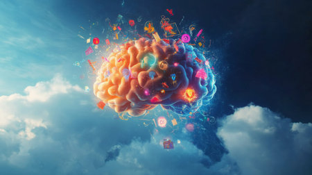 A vibrant and imaginative representation of a brain amidst clouds, showcasing creative icons and symbols that represent thought, innovation, and inspiration.
