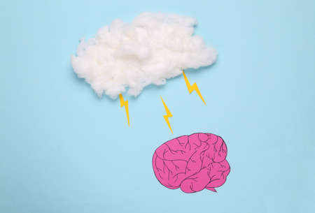 Paper-cut brain whith cloud with lightning on a blue background. The effect of weather on well-being. Headache
