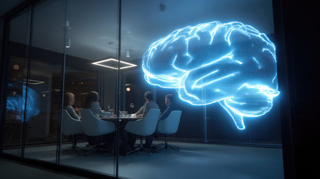 This image depicts a futuristic office meeting with a luminous brain overlay. The scene features people around a table, illuminated with cool tones. The composition includes a glass wall reflection and ambient lighting, creating a high-tech atmosphere. Suitable for illustrating ideas related to innovation, business, or technology.