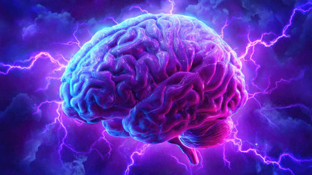 A creative composition of a brain surrounded by light trails, symbolizing electrical impulses and thought processes, set against a dark backdrop