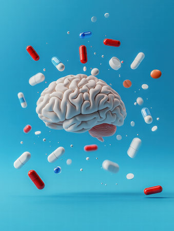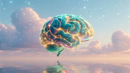 This artwork features a detailed brain against a colorful, abstract background depicting neural patterns.