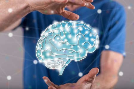 Brain representing artificial intelligence and businessman holding futuristic tablet. Data mining and another modern computer technologies concepts.