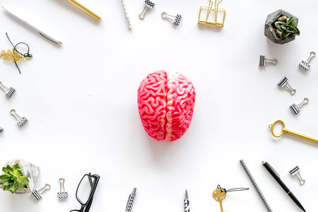 Brainstorm and business discussion with brain, glasses, pens, keys, paperclip frame on white office desk background top view.