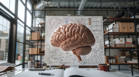 Brain anatomical model on table with blurred glasses of water on foreground